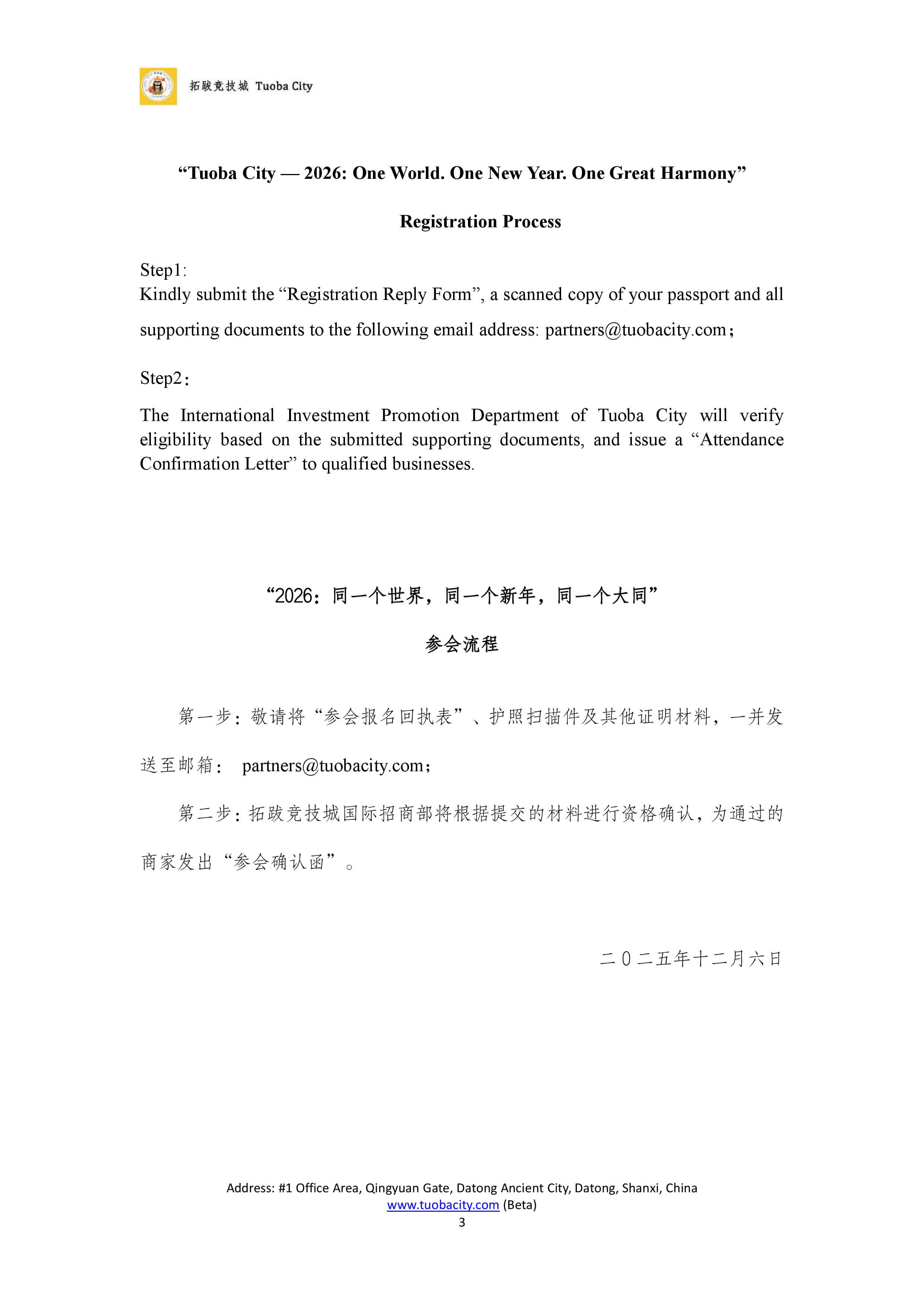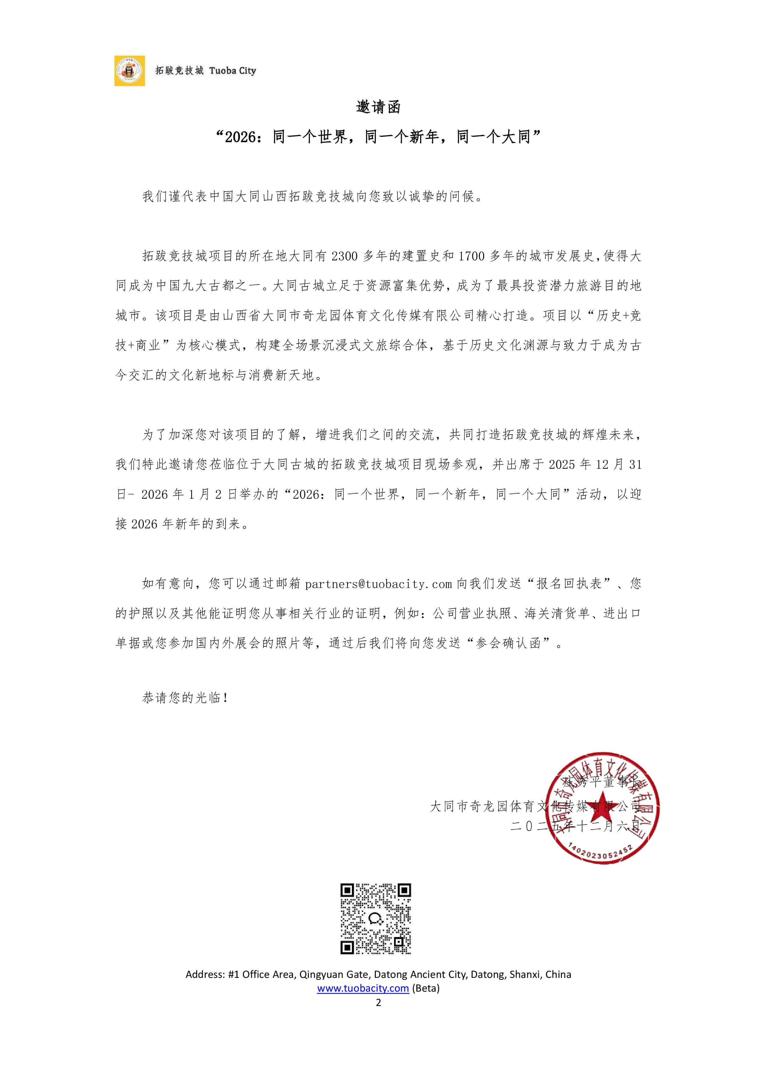 拓跋竞技城“2026:同一个世界,同一个新年,同一个大同“活动邀请函 Date 2025-12-09 16:48:41 Posted by admin Click Source 未知 欢迎全球商家莅临大同拓跋竞技城,共商合作,携手入驻,同创辉煌 报名回执表在本页面下载。 报名回执表下载
